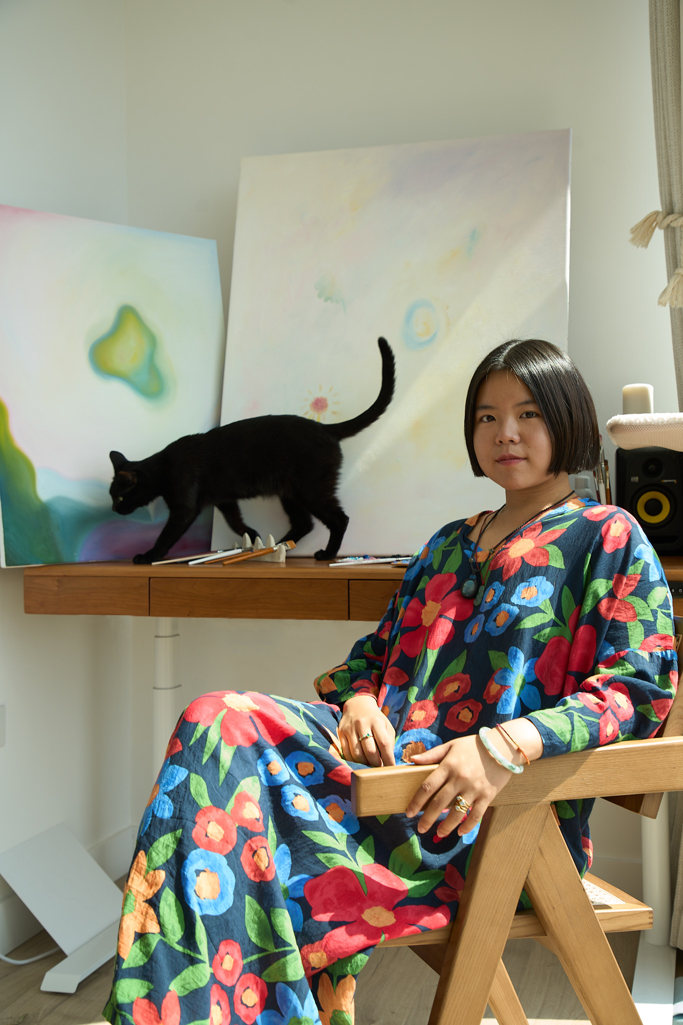 她的创作是一种持续生长的世界建构。通过反复出现的角色、生物、与空间场景,她探索童真、精灵般的内在生命,以及柔软、修复与陪伴的情绪状态。她的作品邀请观者放慢脚步,在触摸、停留与共处中,重新与自身的内在空间建立联系。她关注如何让精神世界在现实中被承载、被照料,并得以长期安放。